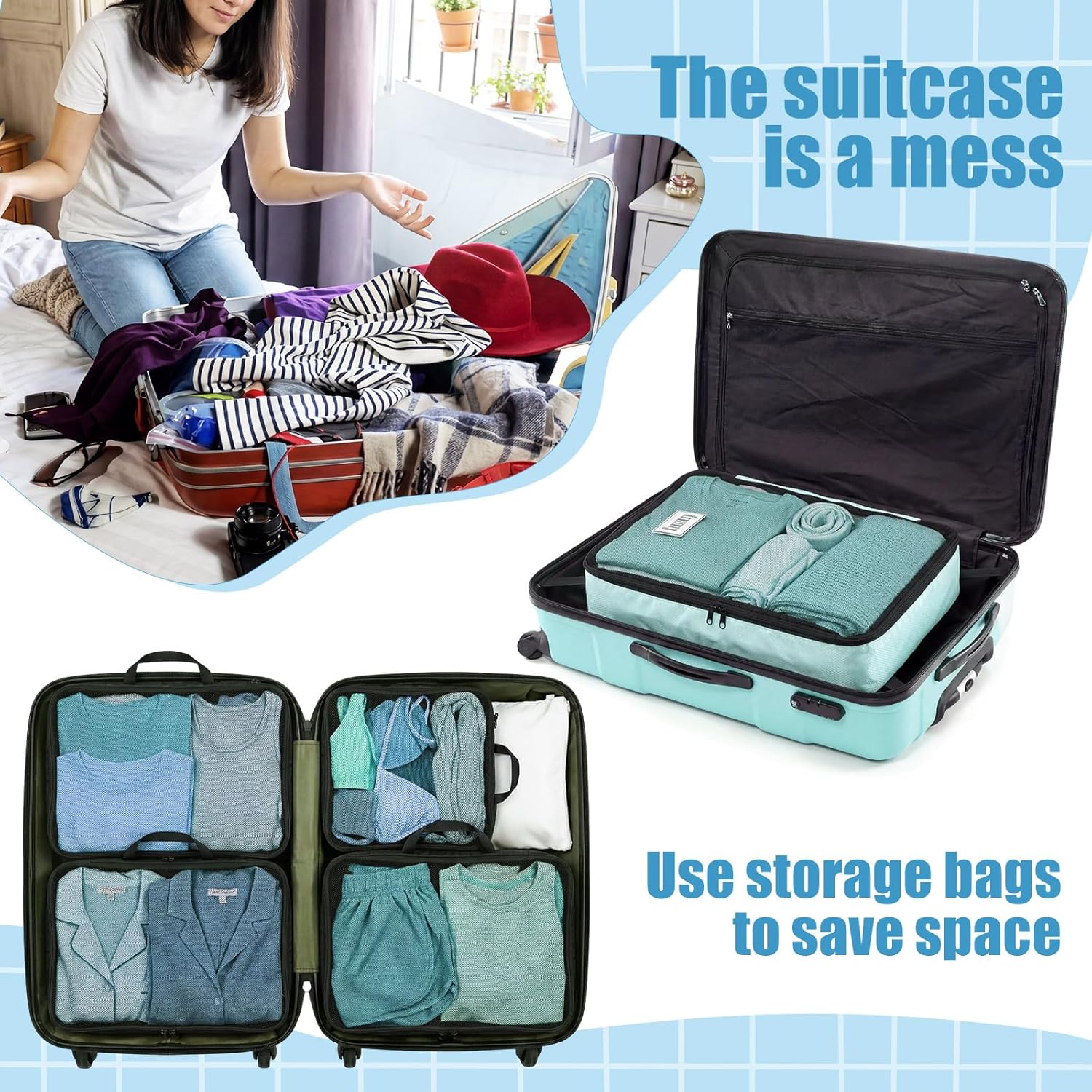 Compression Design Saves Luggage Space: these compression packing cubes keep clothes neatly compressed to reduce suitcase bulk; The foldable structure makes them easy to store when not in use, maximizing luggage space and travel efficiency